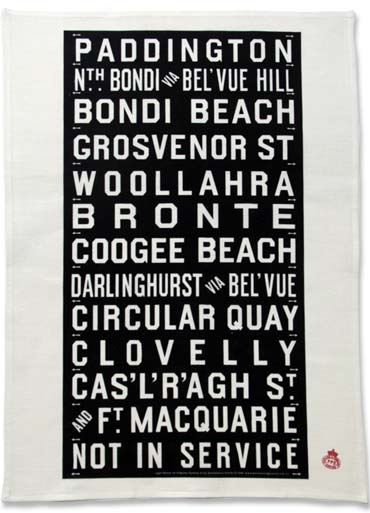This tea towel is one in a series based on original 'R Class' Sydney tram destination blinds circa 1950. It has been screen printed onto premium quality linen using environmentally friendly water based inks.
